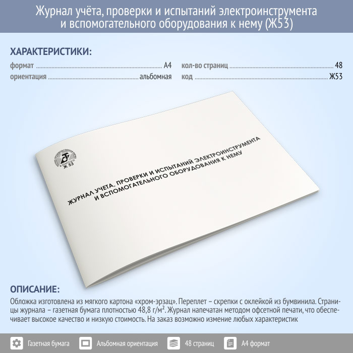 Журнал учета, проверки и испытаний электроинструмента и вспомогательного оборудования к нему (48 стр., Ж53) в Бердске купить