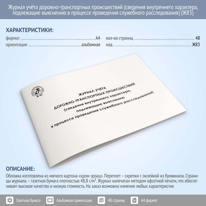 Журнал учета дорожно-транспортных происшествий (сведения внутреннего характера, подлежащие выяснению в процессе проведения служебного расследования) (48 стр., Ж83) в Бердске купить