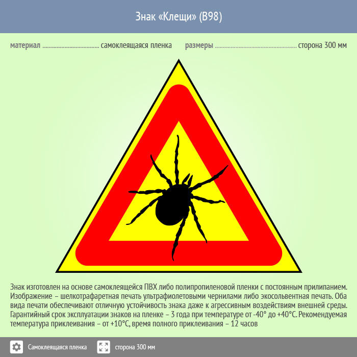 Знак «Клещи», B98 изготавливается в 2-х типоразмерах - сторона 200 мм и сторона 300 мм, но также может быть изготовлен любого размера на самоклеящейся пленке с ламинированием и без, пластике толщиной 0.5, 2 или 4 мм и металле. Также возможно применение фотолюминесцентных и световозвращающих материалов