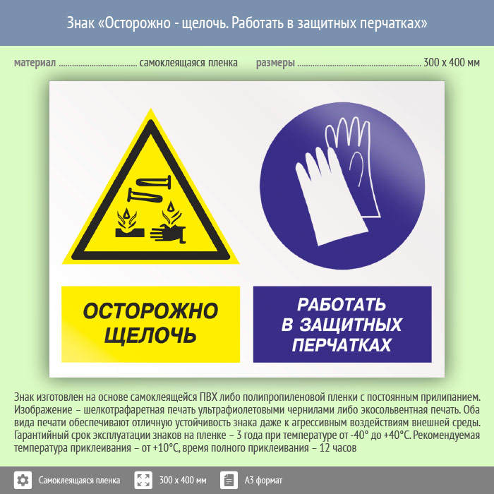 Знак «Осторожно – щелочь. Работать в защитных перчатках» может быть изготовлен любого размера на самоклеящейся пленке, пластике толщиной 0.5, 2 или 4 мм и металле. Также возможно применение фотолюминесцентных и световозвращающих материалов