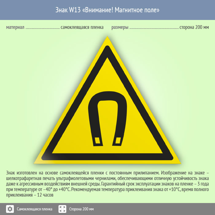 Знак W13 «Внимание! магнитное поле» (пленка, сторона 200 мм)