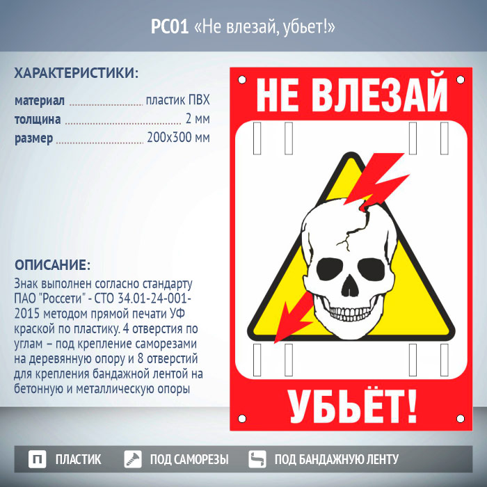 Знак «Не влезай, убьет!», РС01 (пластик 2 мм, 200х300 мм, отверстия под бандажную ленту) в Бердске купить