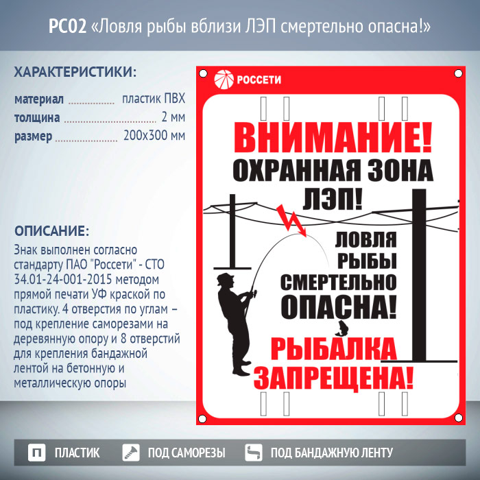 Знак «Ловля рыбы вблизи ЛЭП смертельно опасна!», РС02 (пластик 2 мм, 200х300 мм, отверстия под бандажную ленту) в Бердске купить