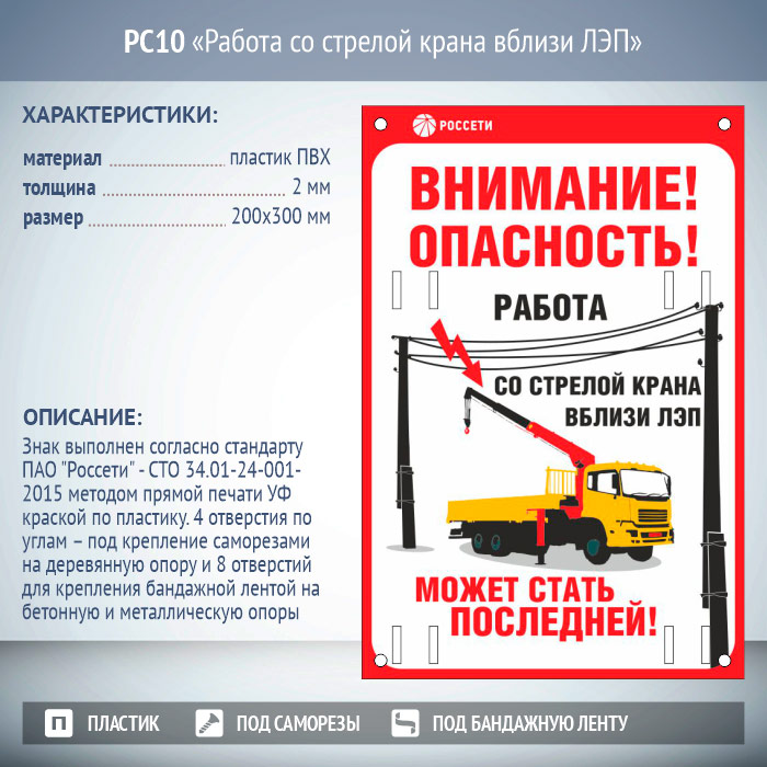 Знак «Работа со стрелой крана вблизи ЛЭП», РС10 (пластик 2 мм, 200х300 мм, отверстия под бандажную ленту) в Бердске купить