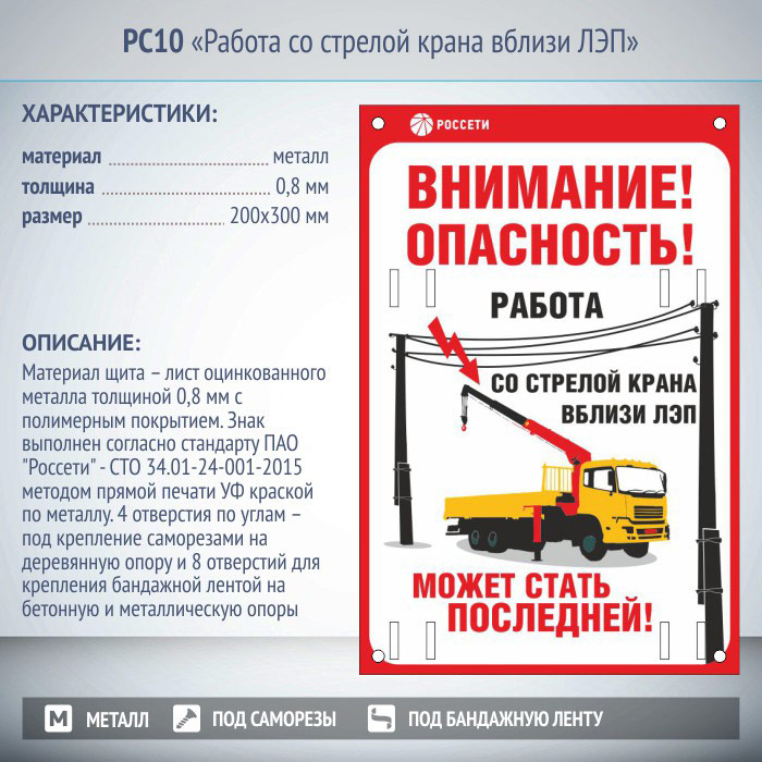 Знак «Работа со стрелой крана вблизи ЛЭП», РС10 (металл, 200х300 мм, отверстия под бандажную ленту) в Бердске купить
