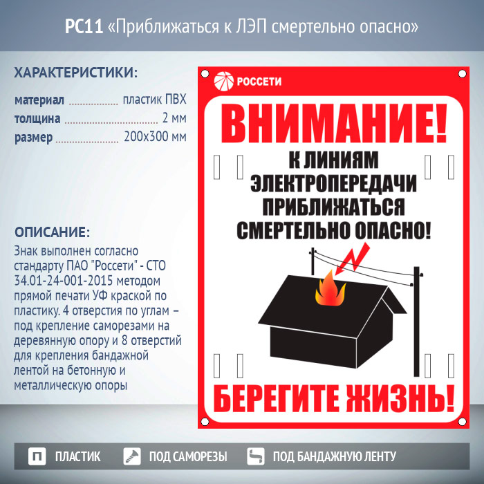 Знак «Приближаться к ЛЭП смертельно опасно», РС11 (пластик 2 мм, 200х300 мм, отверстия под бандажную ленту) в Бердске купить