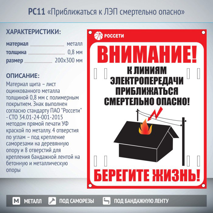 Знак «Приближаться к ЛЭП смертельно опасно», РС11 (металл, 200х300 мм, отверстия под бандажную ленту) в Бердске купить