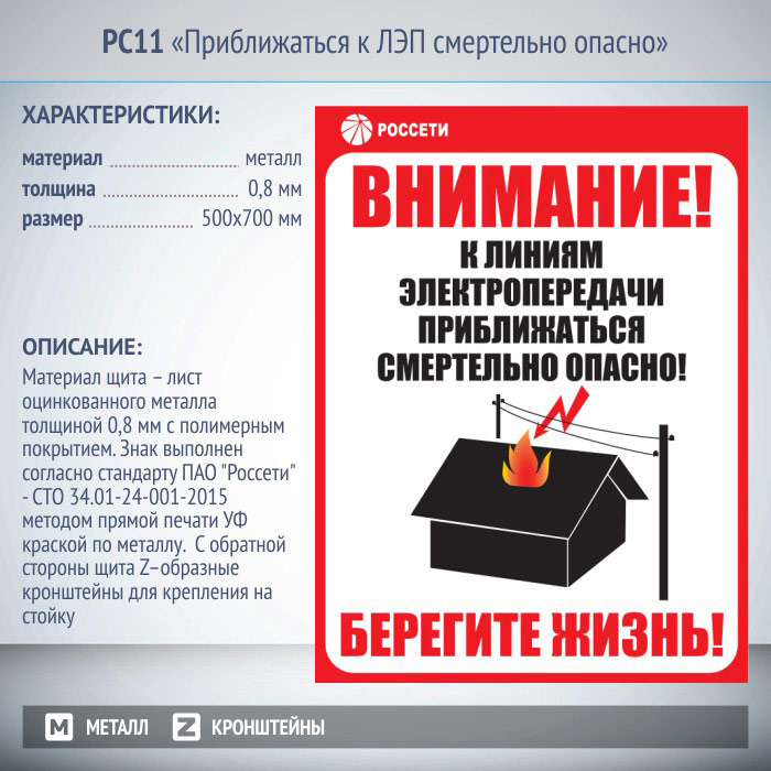 Информационный щит «Приближаться к ЛЭП смертельно опасно», РС11 (металл, 500х700 мм, кронштейны для крепления) в Бердске купить