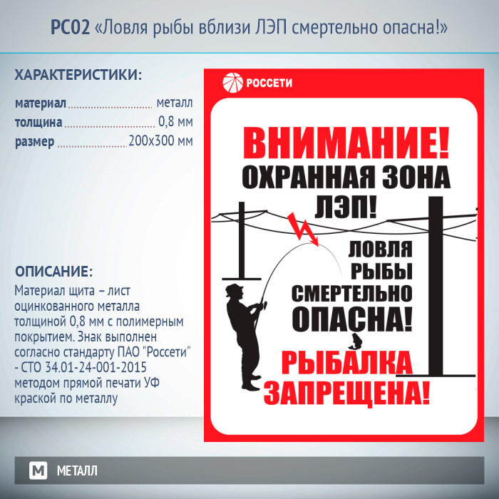 Знак «Ловля рыбы вблизи ЛЭП смертельно опасна!», РС02 (металл, 200х300 мм) в Бердске купить