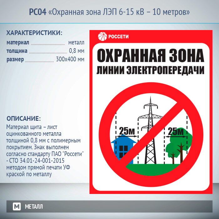 Знак «Охранная зона ЛЭП 6-15 кВ – 10 метров», РС04 (металл, 300х400 мм) в Бердске купить
