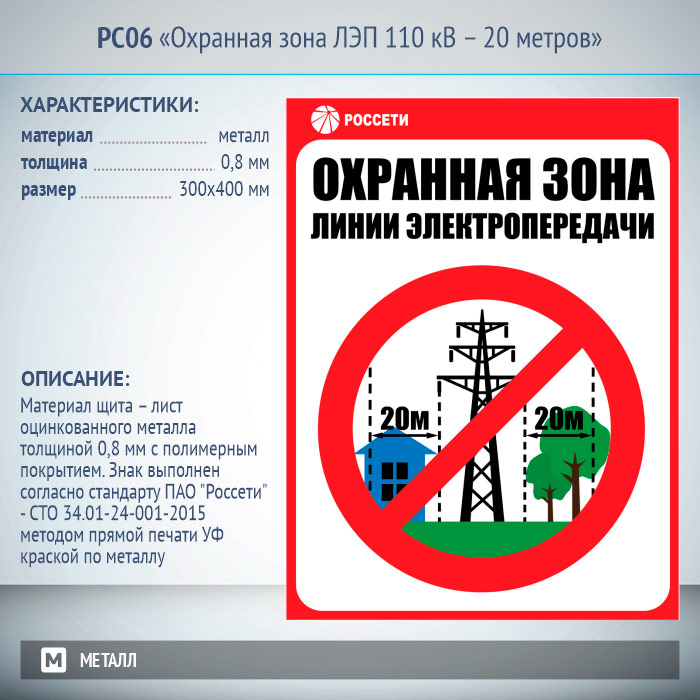 Знак «Охранная зона ЛЭП 110 кВ – 20 метров», РС06 (металл, 300х400 мм) в Бердске купить