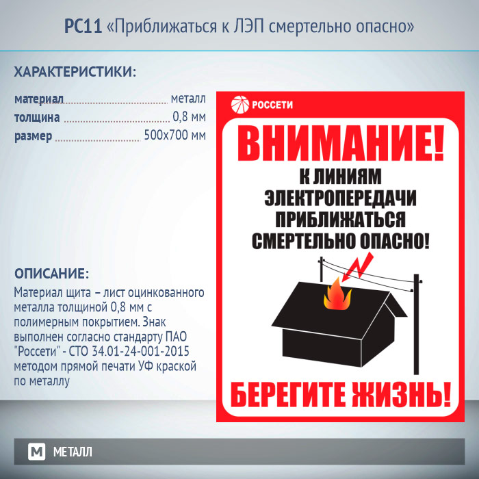 Информационный щит «Приближаться к ЛЭП смертельно опасно», РС11 (металл, 500х700 мм) в Бердске купить