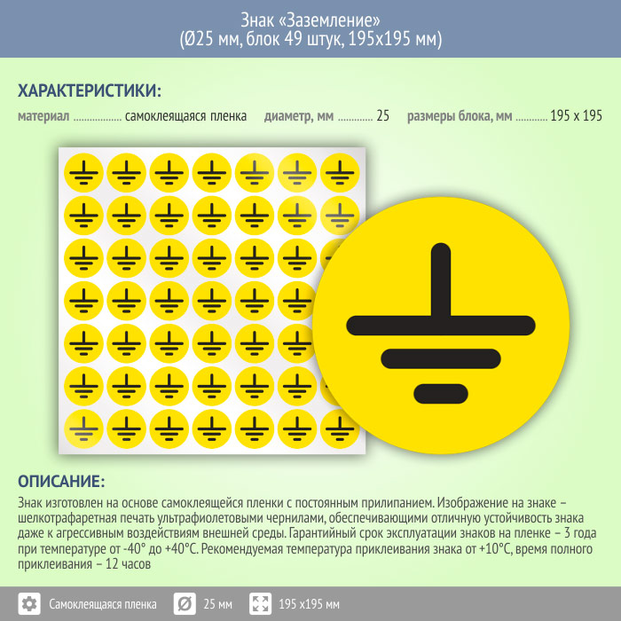 Знак (плакат) «Заземление», S46 (пленка, диаметр 25 мм, блок 49 штук, 195х195 мм) в Бердске купить