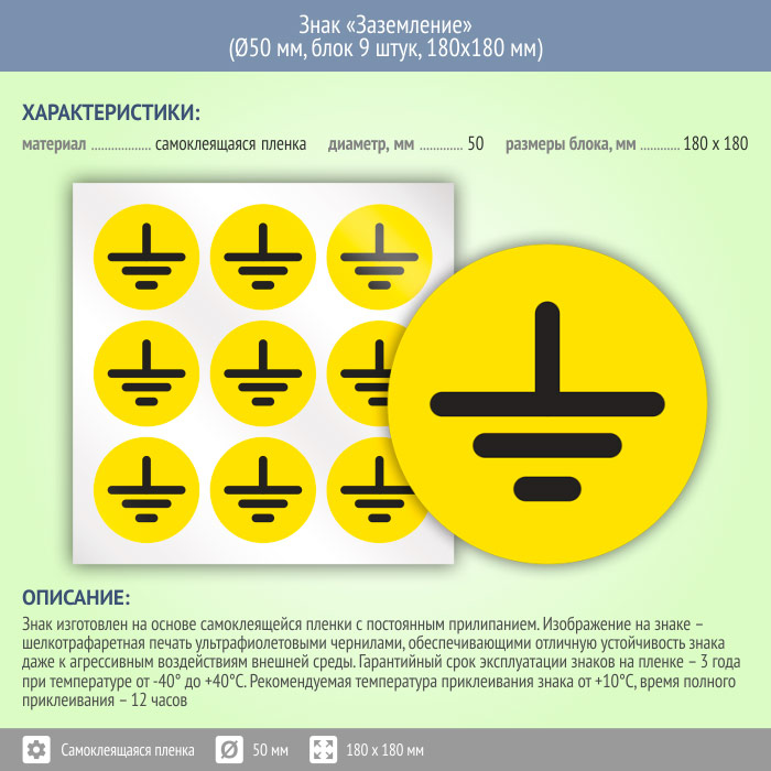 Знак (плакат) «Заземление», S46 (пленка, диаметр 50 мм, блок 9 штук, 180х180 мм) в Бердске купить