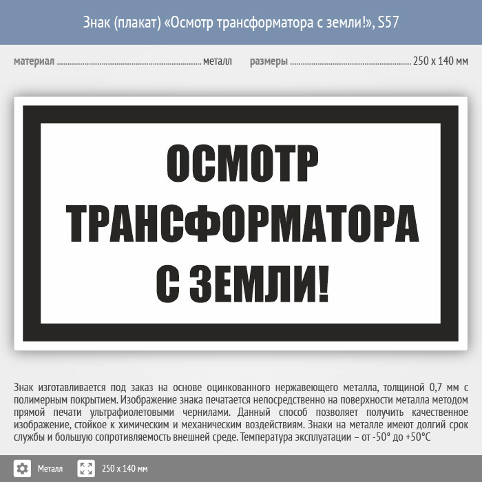 Знак (плакат) «Осмотр трансформатора с земли!», S57 (металл, 250х140 мм) в Бердске купить