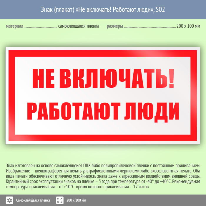Знак (плакат) «Не включать! Работают люди», S02 (пленка, 200х100 мм) в Бердске купить