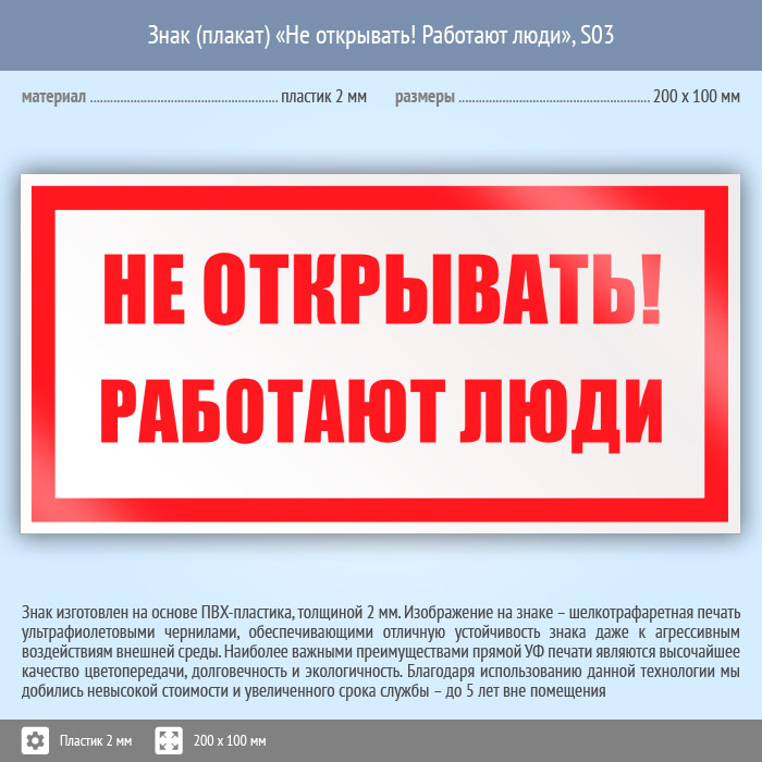 Знак (плакат) «Не открывать! Работают люди», S03 (пластик, 200х100 мм) в Бердске купить