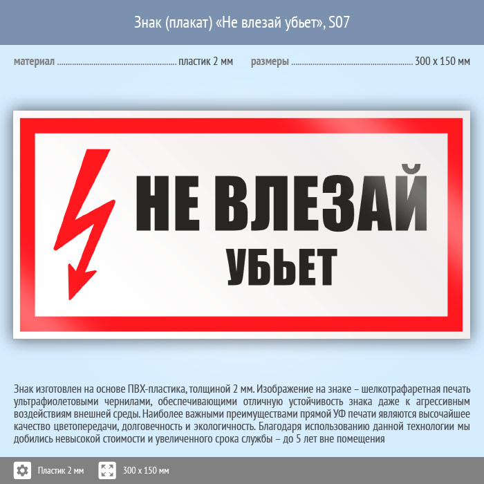 Знак (плакат) «Не влезай убьет», S07 (пластик, 300х150 мм) в Бердске купить