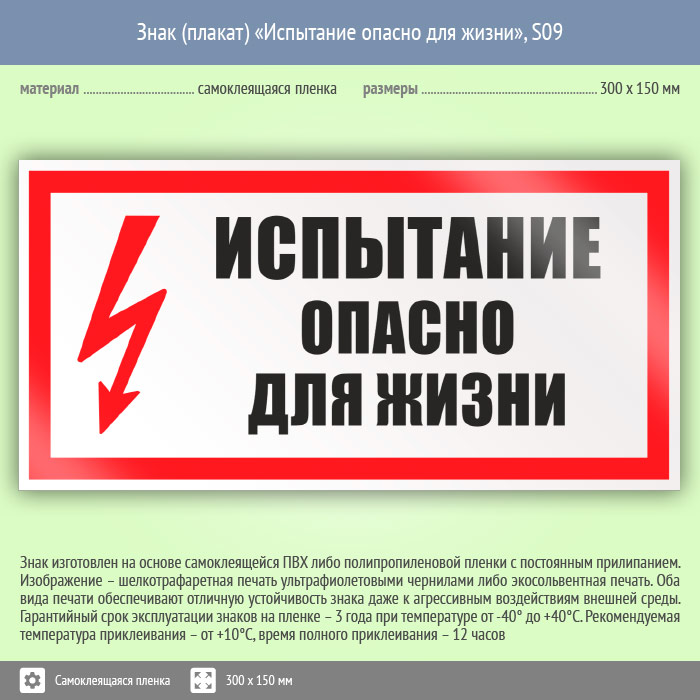 Знак (плакат) «Испытание опасно для жизни», S09 (пленка, 300х150 мм) в Бердске купить