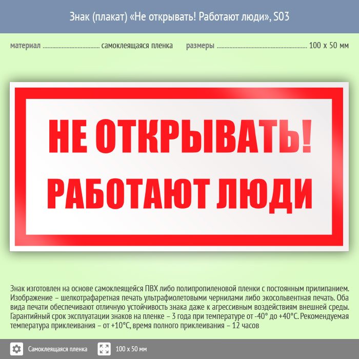 Знак (плакат) «Не открывать! Работают люди», S03 (пленка, 100х50 мм) в Бердске купить