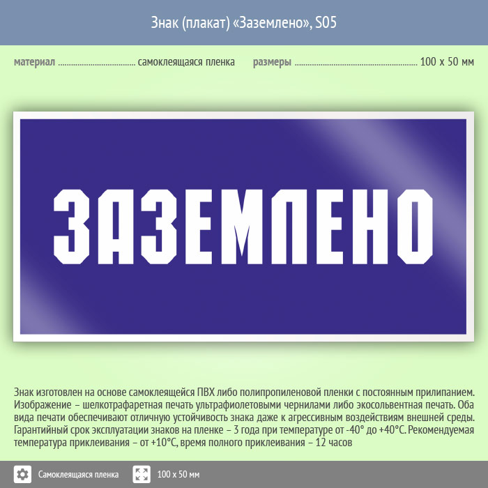 Знак (плакат) «Заземлено», S05 (пленка, 100х50 мм) в Бердске купить