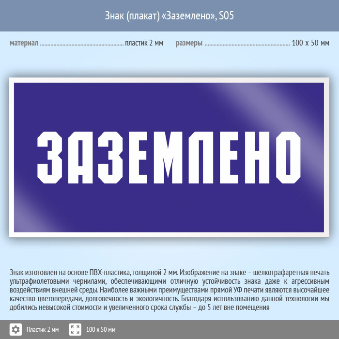 Знак (плакат) «Заземлено», S05 (пластик, 100х50 мм) в Бердске купить