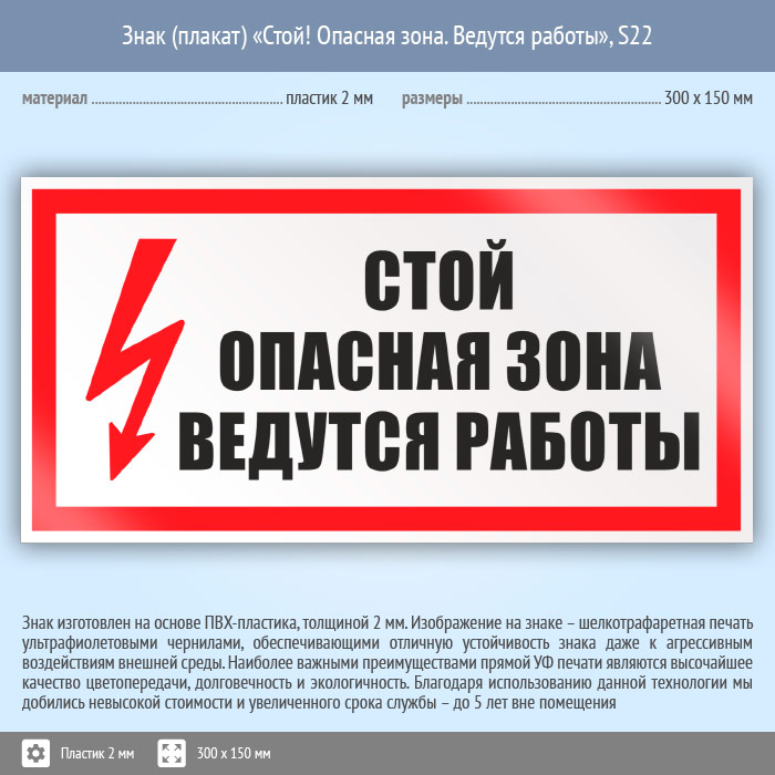 Знак (плакат) «Стой! Опасная зона. Ведутся работы», S22 (пластик, 300х150 мм) в Бердске купить