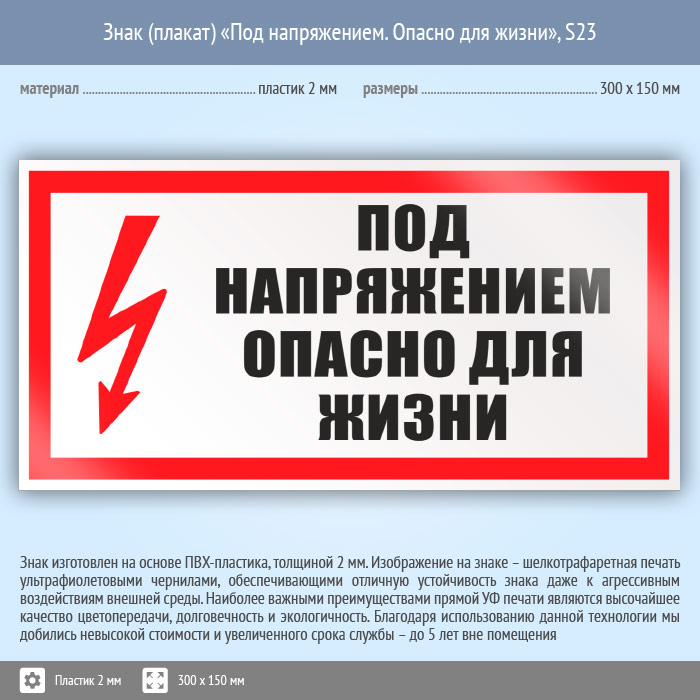 Знак (плакат) «Под напряжением. Опасно для жизни», S23 (пластик, 300х150 мм) в Бердске купить