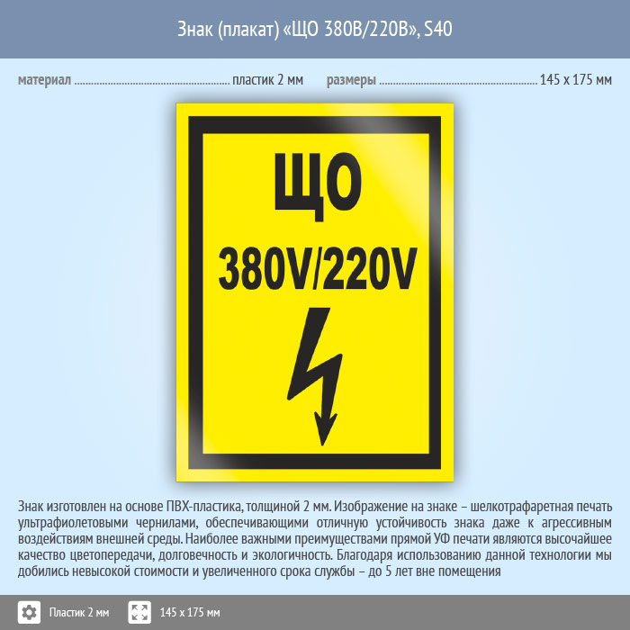 Знак (плакат) «ЩО 380В/220В», S40 (пластик, 145х175 мм) в Бердске купить