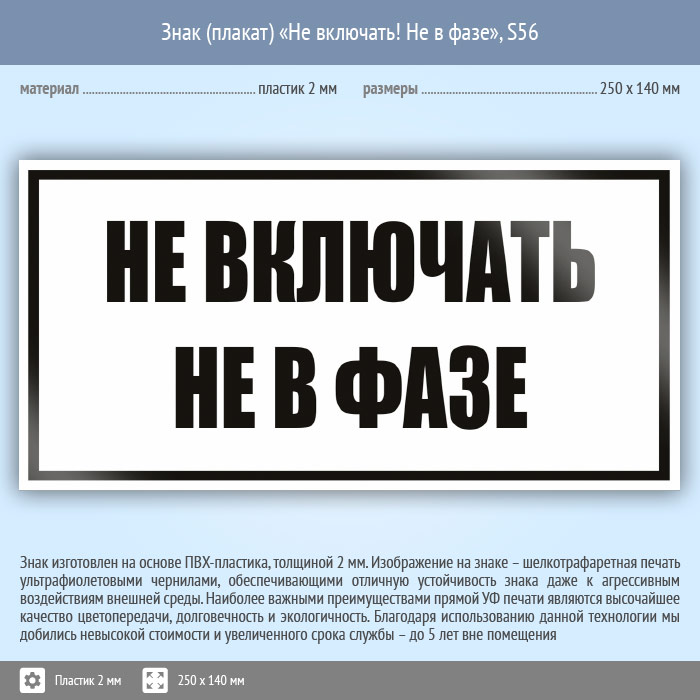 Знак (плакат) «Не включать! Не в фазе», S56 (пластик, 250х140 мм) в Бердске купить