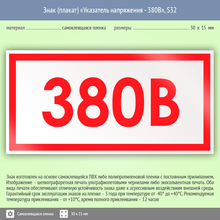 Знак (плакат) «Указатель напряжения - 380В», S32 (50 штук, пленка, 30х15 мм) в Бердске купить