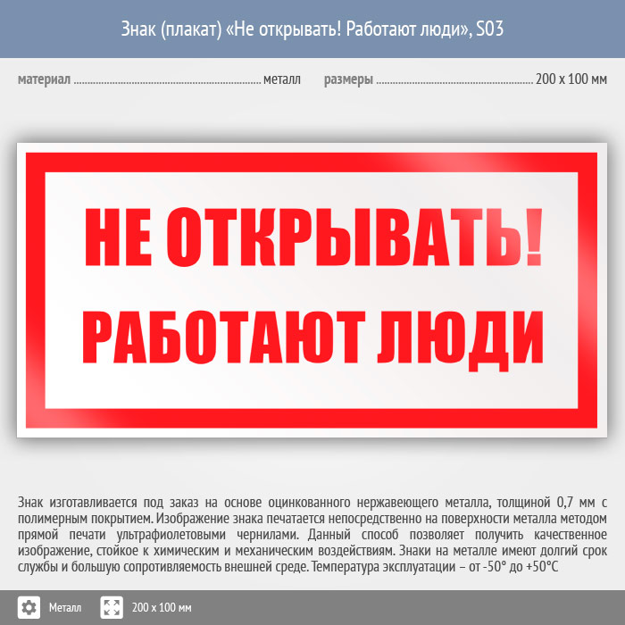 Знак (плакат) «Не открывать! Работают люди», S03 (металл, 200х100 мм) в Бердске купить