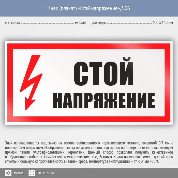 Знак (плакат) «Стой напряжение», S06 (металл, 300х150 мм) в Бердске купить