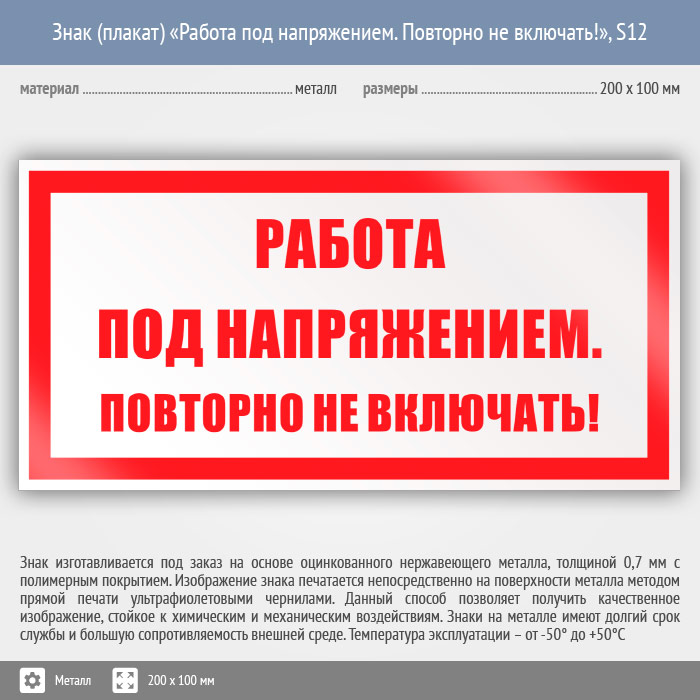Знак (плакат) «Работа под напряжением. Повторно не включать!», S12 (металл, 200х100 мм) в Бердске купить