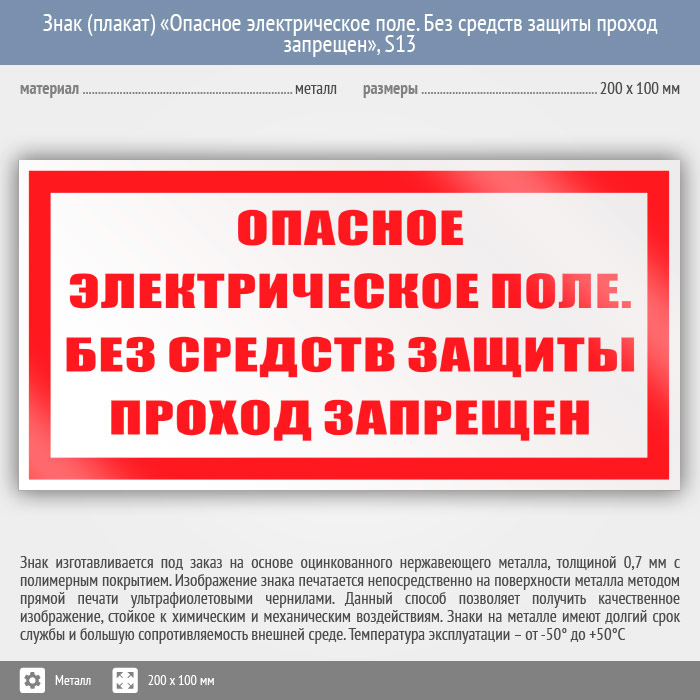 Знак (плакат) «Опасное электрическое поле. Без средств защиты проход запрещен», S13 (металл, 200х100 мм) в Бердске купить