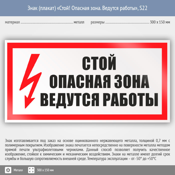 Знак (плакат) «Стой! Опасная зона. Ведутся работы», S22 (металл, 300х150 мм) в Бердске купить