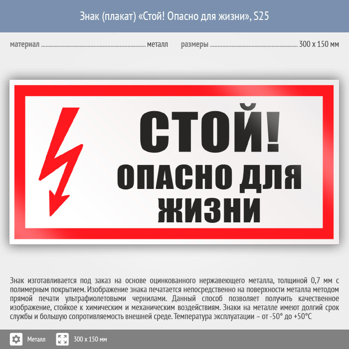 Знак (плакат) «Стой! Опасно для жизни», S25 (металл, 300х150 мм) в Бердске купить