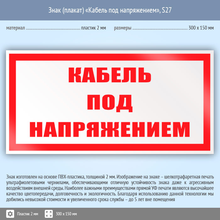 Знак (плакат) «Кабель под напряжением», S27 (пластик, 300х150 мм) в Бердске купить