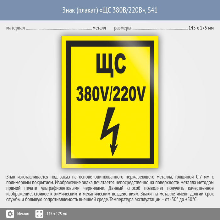 Знак (плакат) «ЩС 380В/220В», S41 (металл, 145х175 мм) в Бердске купить