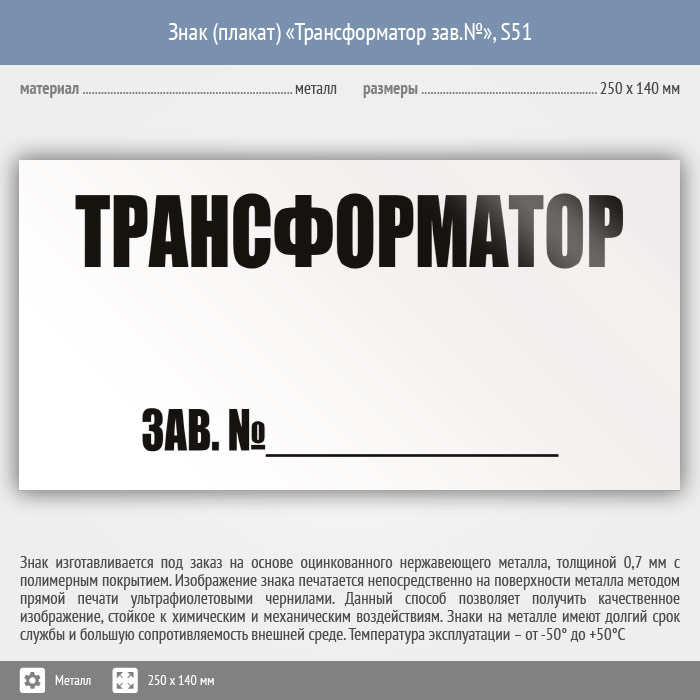 Знак (плакат) «Трансформатор зав.№», S51 (металл, 250х140 мм) в Бердске купить