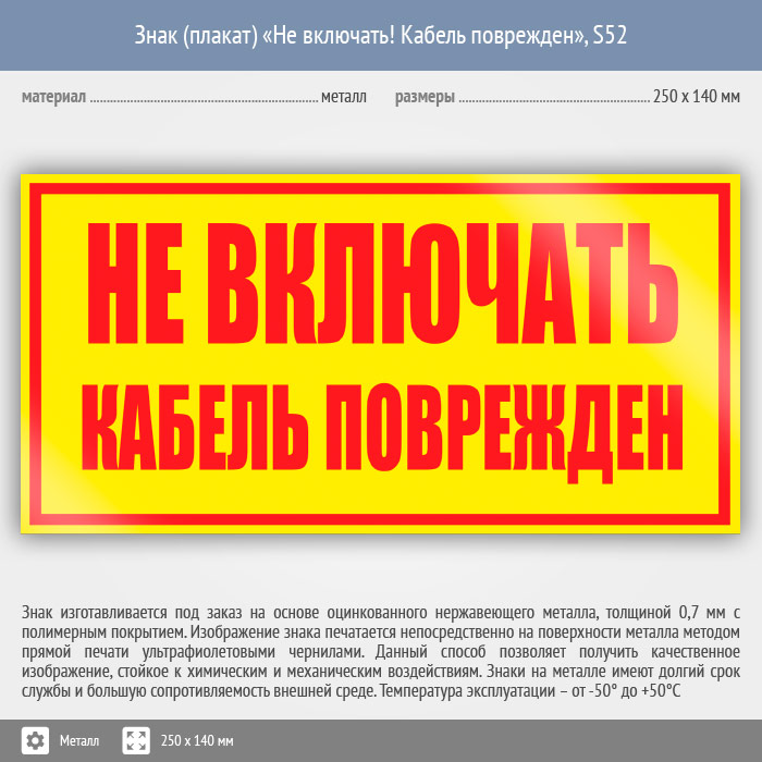 Знак (плакат) «Не включать! Кабель поврежден», S52 (металл, 250х140 мм) в Бердске купить