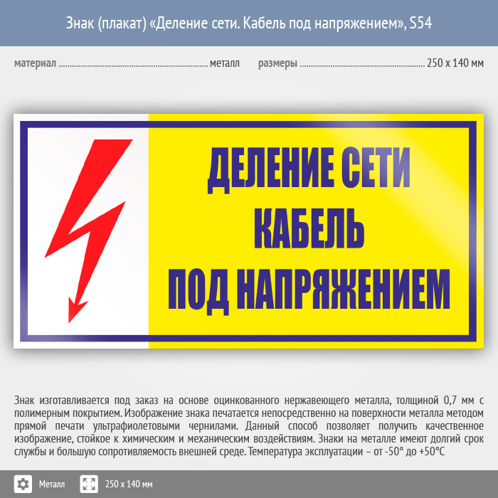 Знак (плакат) «Деление сети. Кабель под напряжением», S54 (металл, 250х140 мм) в Бердске купить