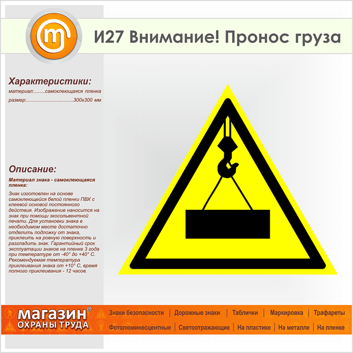Знак «Внимание! Пронос груза», И27 (пленка, сторона 300 мм) в Бердске купить