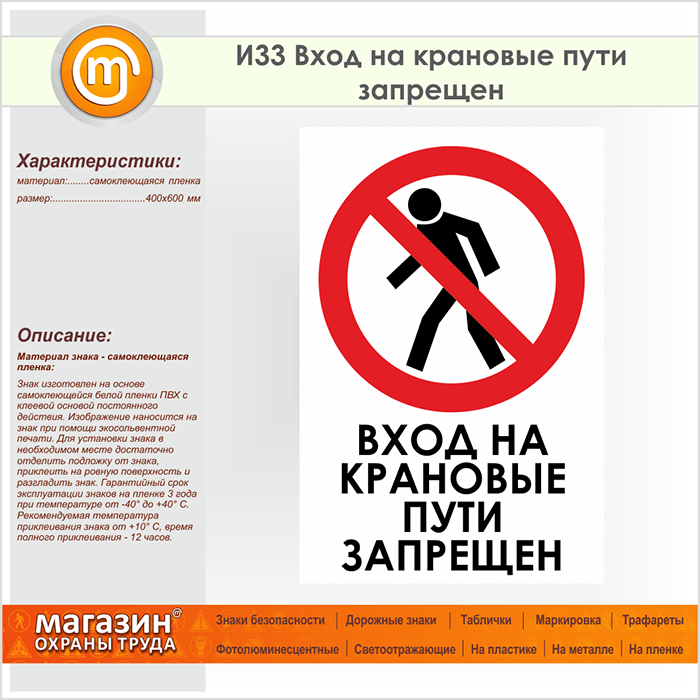 Знак «Вход на крановые пути запрещен», И33 (пленка, 400х600 мм) в Бердске купить