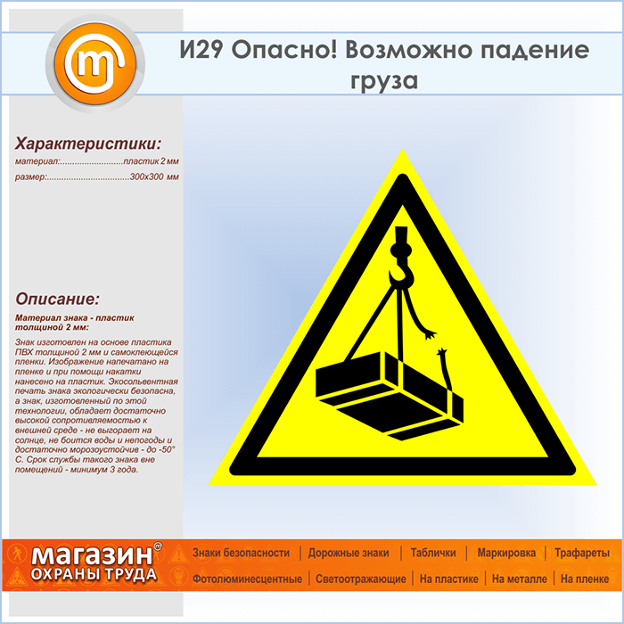 Знак «Опасно! Возможно падение груза», И29 (пластик, сторона 300 мм) в Бердске купить