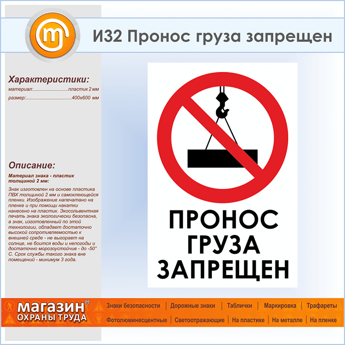 Знак «Пронос груза запрещен», И32 (пластик, 400х600 мм) в Бердске купить