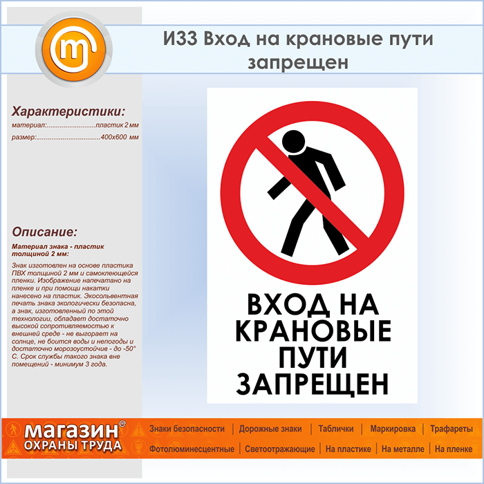 Знак «Вход на крановые пути запрещен», И33 (пластик, 400х600 мм) в Бердске купить