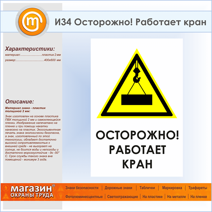 Знак «Осторожно! Работает кран», И34 (пластик, 400х600 мм) в Бердске купить