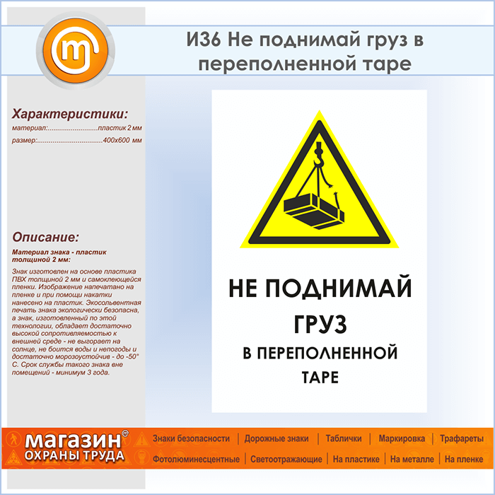 Знак «Не поднимай груз в переполненной таре», И36 (пластик, 400х600 мм) в Бердске купить