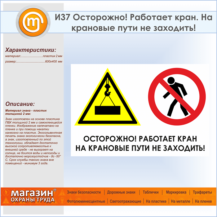 Знак «Осторожно! Работает кран. На крановые пути не заходить!», И37 (пластик, 600х400 мм) в Бердске купить